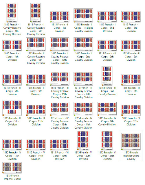 Well, ok... my OCD kicked in and I ended up with over 120 units - the entire French army for Waterloo (suitable, of course for any part of the 100 days campaign)! They are divided into divisions, which is how I normally set out collecting an army. Regiments were only issued one eagle in 1815 and this was carried by the first battalion. Opinions seem divide as to whether or not the infantry flags had fringe, but I decided to include it. If you fall into the camp of "without", it is easy enough to trim them off when you cut out the flag!