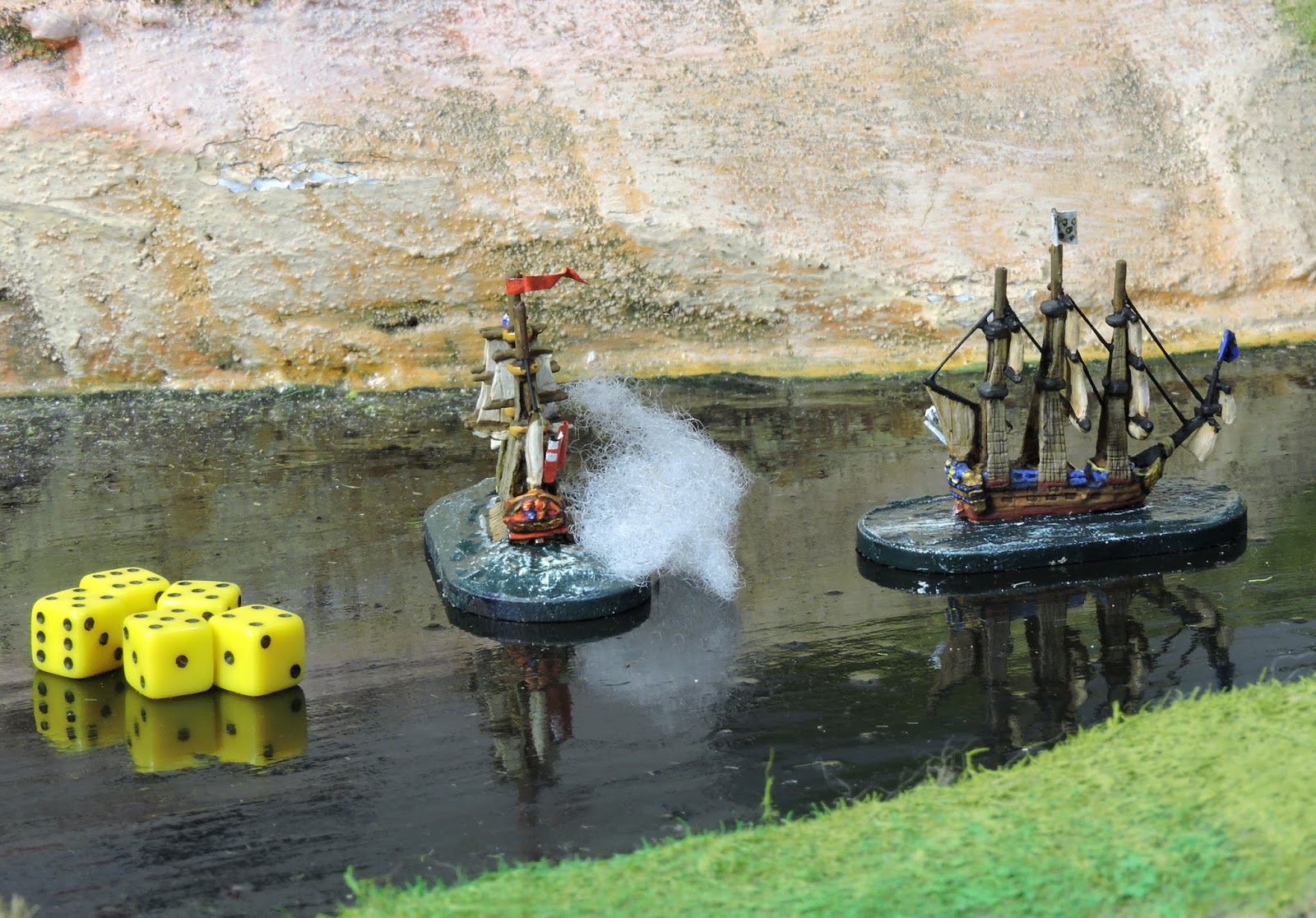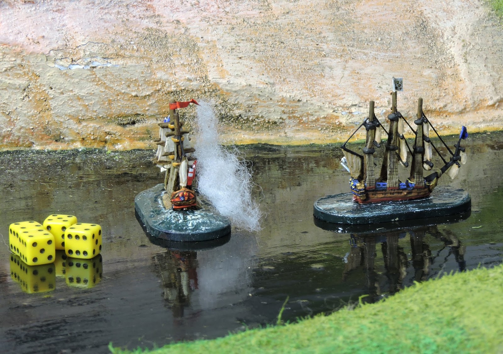 Thus far the French 4th rate had escaped any damage but on T10 she was stopped by the headwind for two turns whilst Portsmouth used her oars to come broadside on, hold position and at close range, rake her stern twice scoring 9 hits and badly damaging the French ship.
