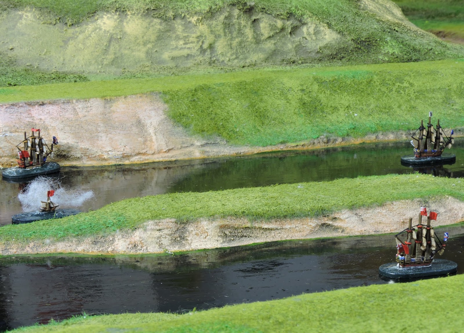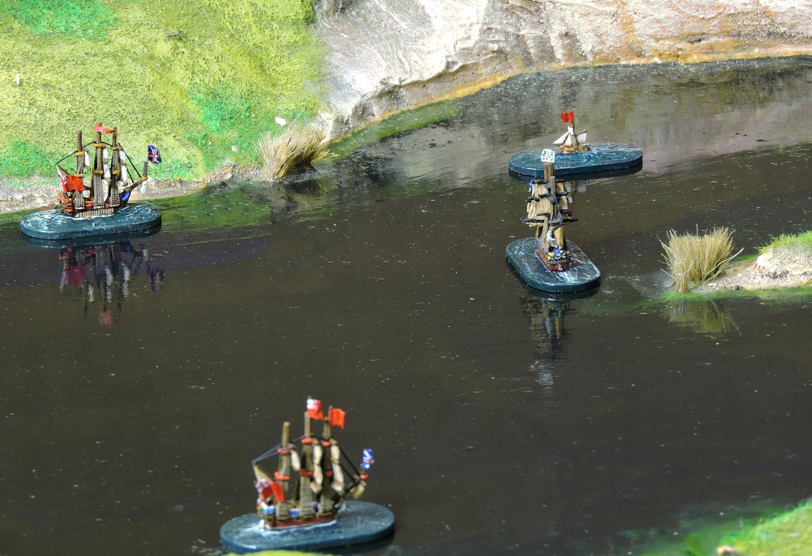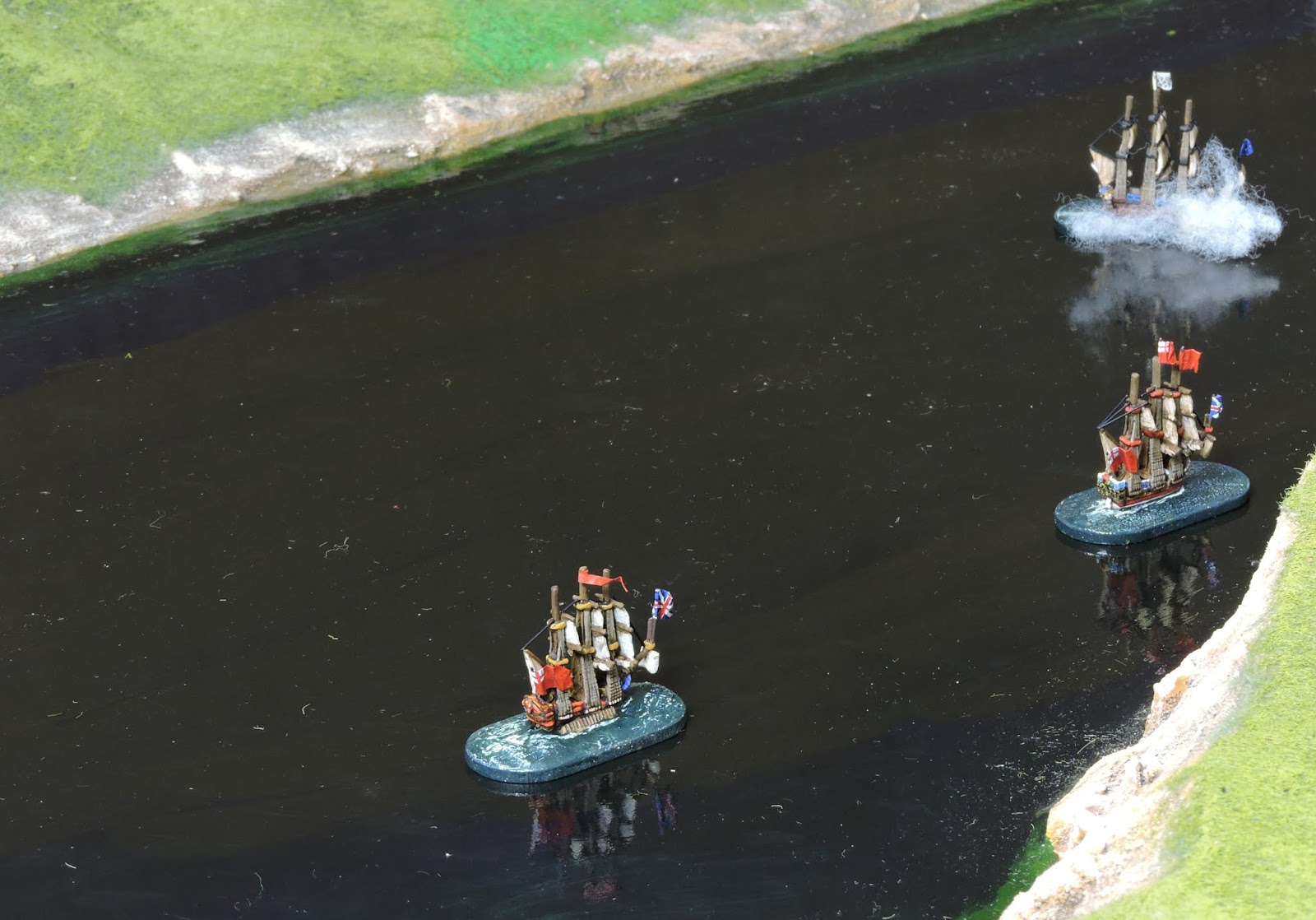 The battle opens with Duc hugging the southern shore of the bay and heading seaward with her English opponents several ships' length behind on the north shore. Unless the captains attempt to tack which is risky and may result in the vessel being in irons, progress against the headwind will be very slow with the galley frigate having the most predictable progress.