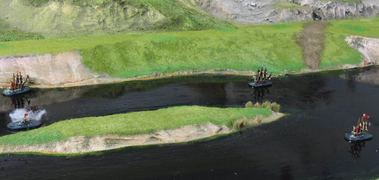 T17 Clearing the island both ships prepare for the show down. The open water is about two inches in front of both ships.