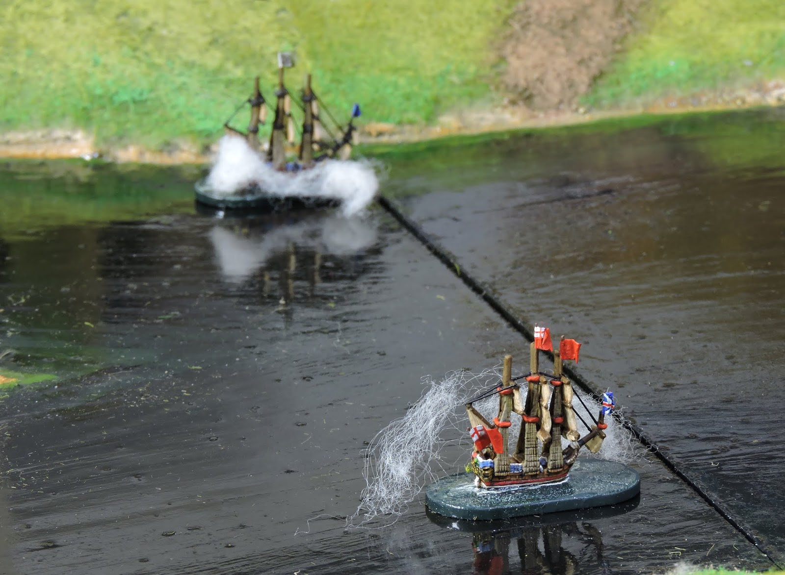 Duc had suffered considerable damage and was proceeding at half speed and not risking the tacking manoeuvre which might immobilize her again. Dartmouth has closed but is also somewhat battered after fire from both Duc and whilst in irons, from Argent.