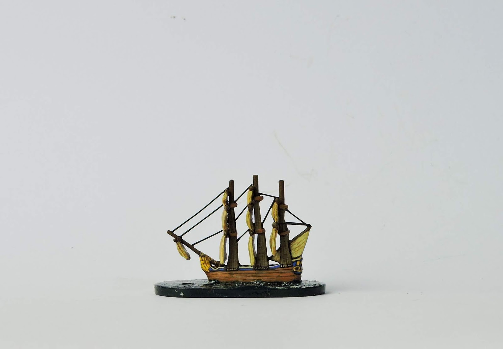 As yet unflagged, it is likely to be used as one of the capture merchantmen Slothany for example or Matthias. These ships served in the Royal Navy but were captured form the Dutch.