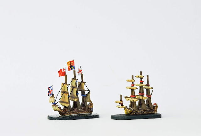 The big difference between the way this one was done and the normal method was that the Royal Katherine was completely assembled and glued before painting. I normally paint the hull and varnish it before adding pre painted sails. The shot above shows the remarkable difference between two versions of the same model - rigged for battle and 'in ordinary' (step 1). I have yet to rig Royal Katherine and add attending smaller craft around her on this base. The game will feature around 12 such ships between 1st and 3rd rate 'in ordinary ' and moored between Gillingham Reach and Rochester Bridge.