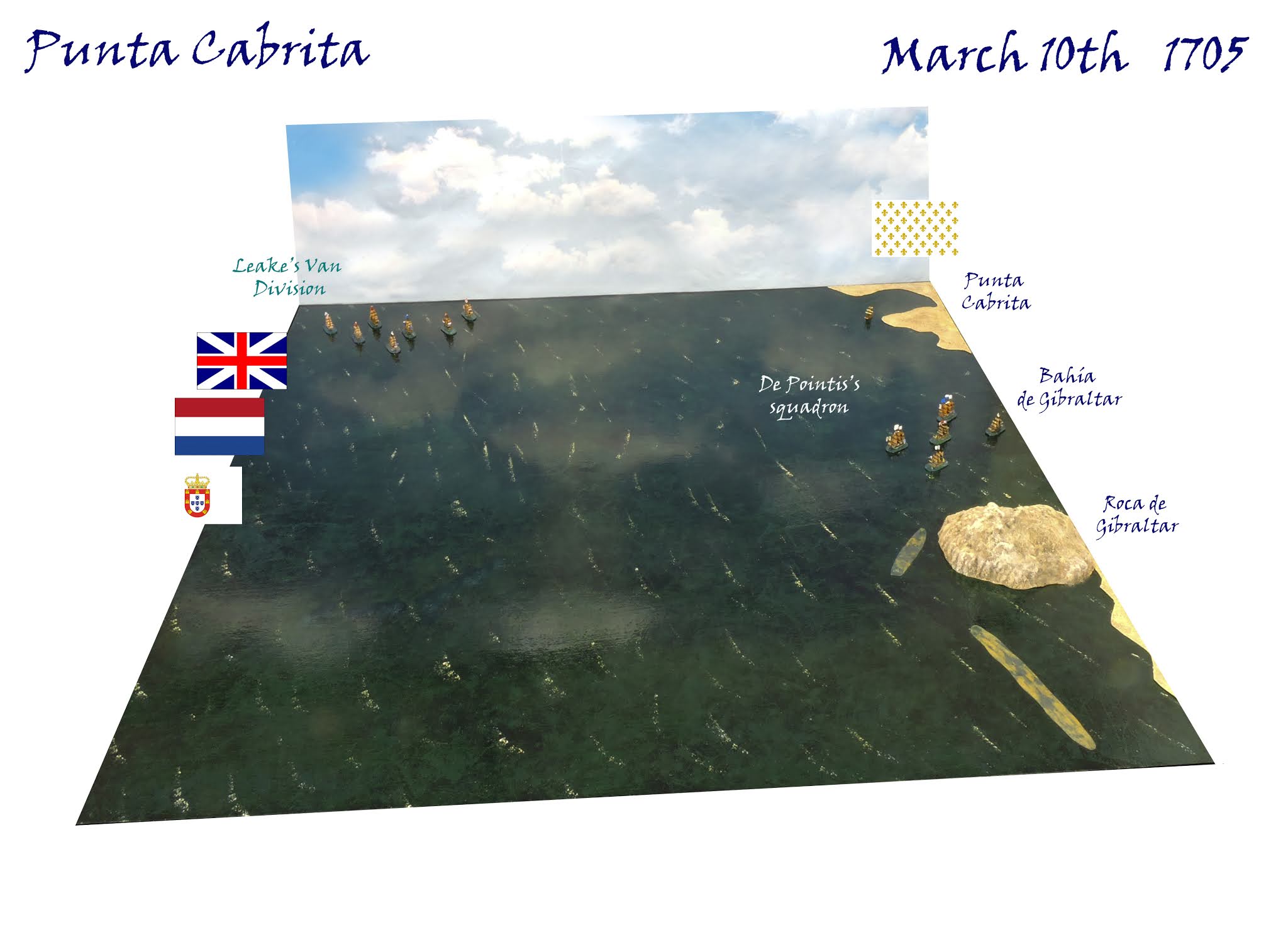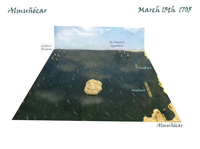 Inspired by a post on the Mad for War Facebook Group I created and played the Battle of Punta Cabrita (Marbella) March 10th 1705, within 24 hours of reading the historical background. A French squadron which had been attempting to recapture Gibraltar for the Bourbon cause is attacked as it withdraws from Bahia de Gibraltar, off Punta Cabrita which is literally at the mouth of the bay opposite the Rock.