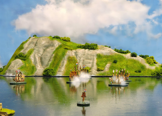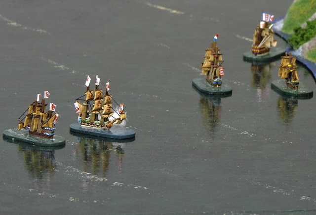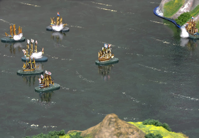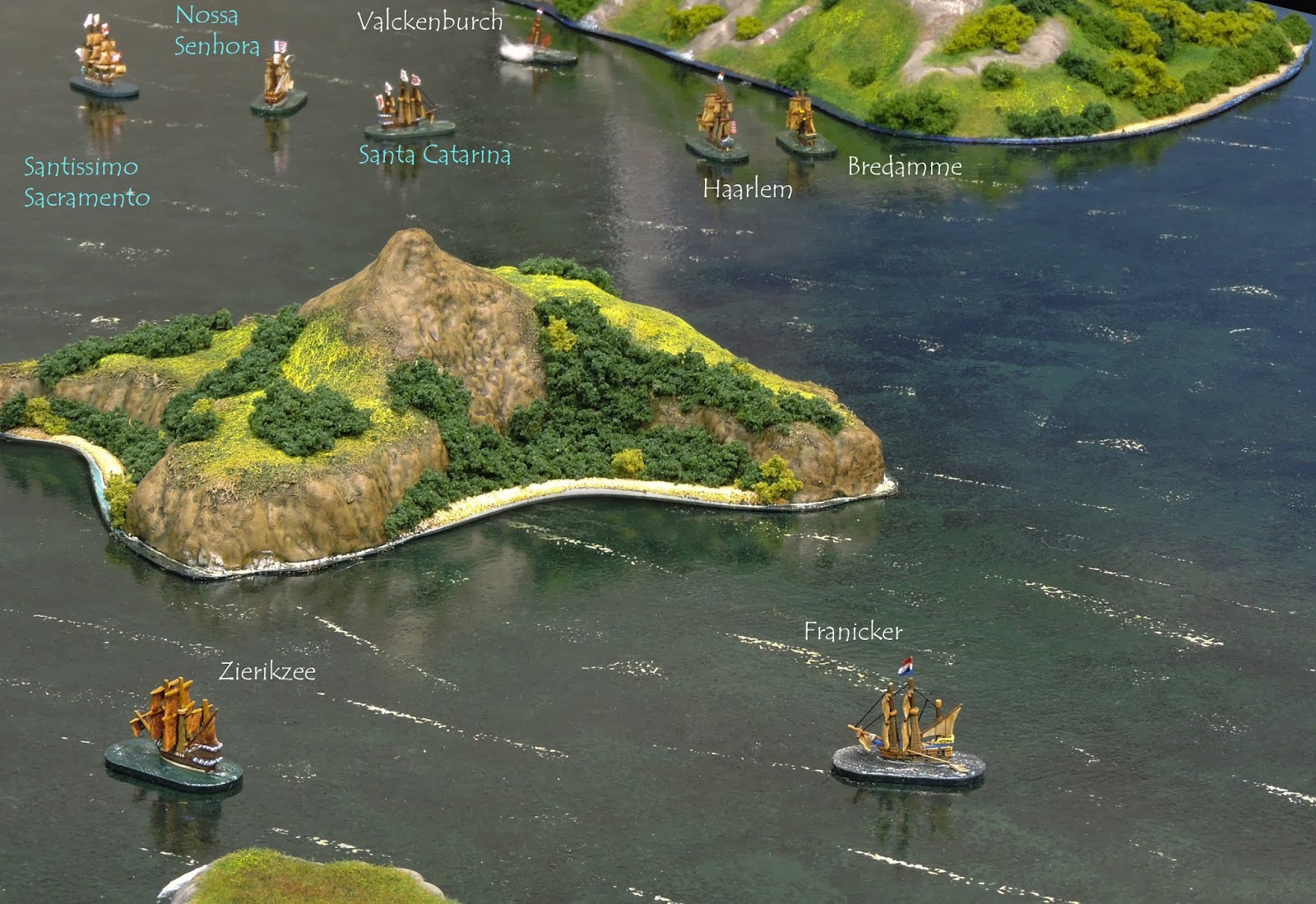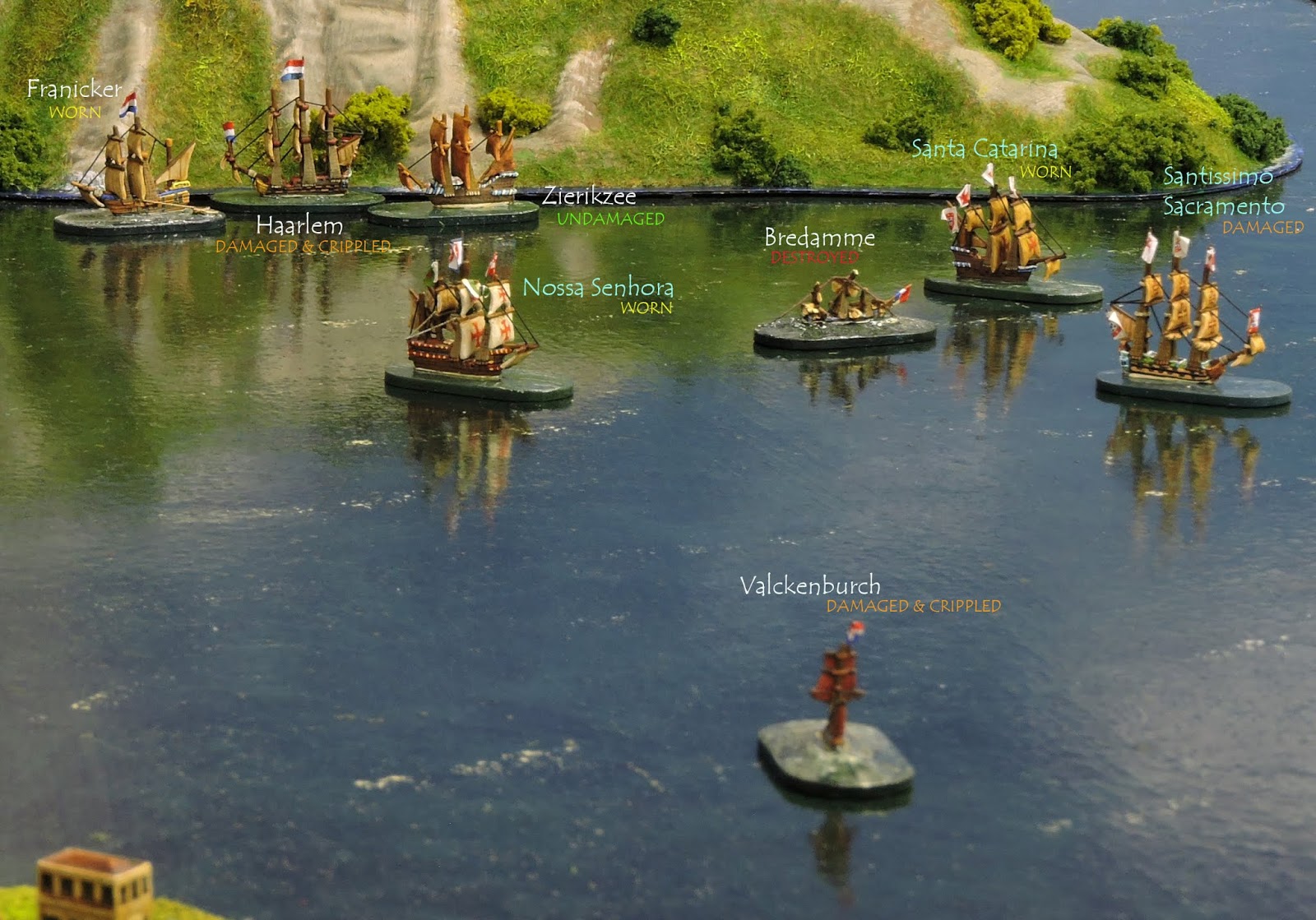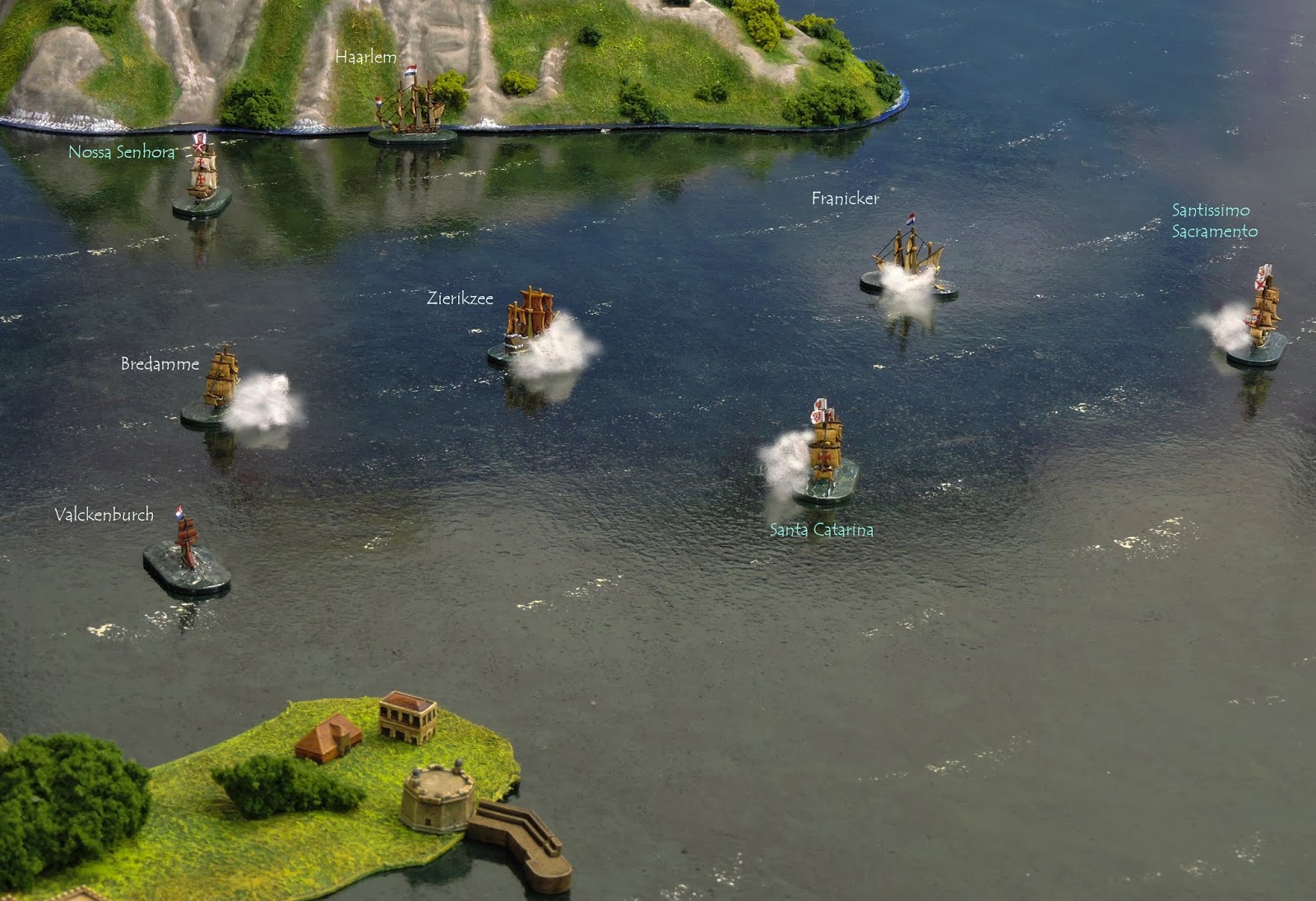 On turn 5, Santissimo Sacramento landed several more hits on Haarlem and only the presence of der Veere prevented her crew from abandoning ship and seeking sanctuary on the island which was by now less than 100 yards distant.