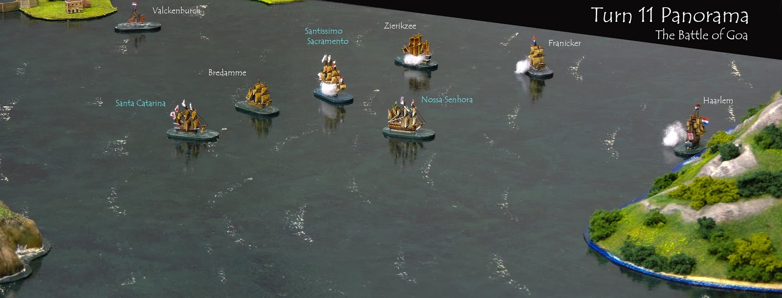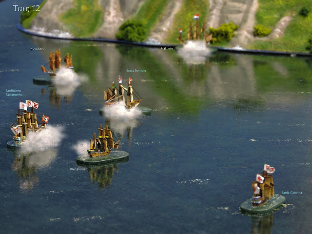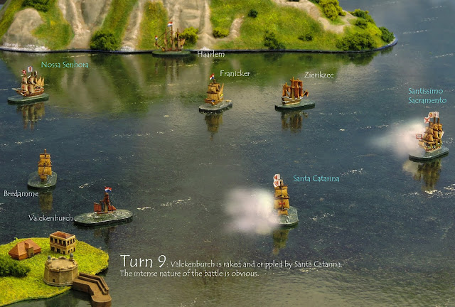 Several ships began a weaving dance of engaging with targets coming to bear and disappearing quickly during turns 7-10. Franicker received the attention of da Silva's flagship in a running fight during which she sustained considerable damage. Valckenburch was subjected to a bow rake which crippled her causing the little ship to continue to sail in a counter-clockwise circle for the remainder of the action.