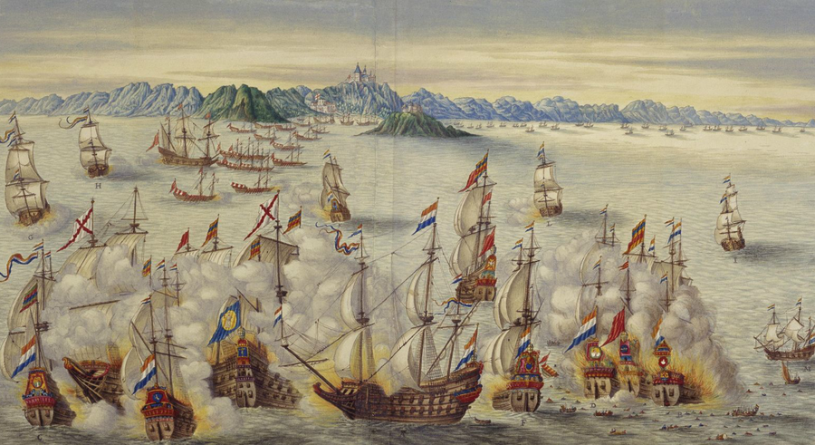 Even the mast-less and crippled Haarlem found herself back in the fight as ships sailed by. Her gunners, emboldened by the heroic exploits of Bredamme in particular, scored hits on two enemy ships.