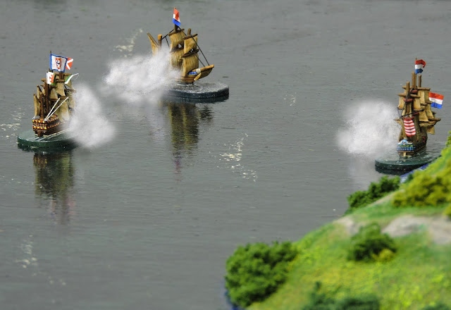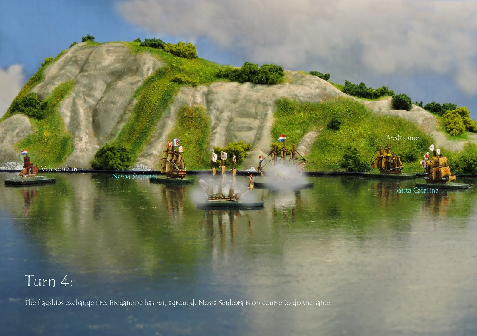 Shooting began on turn 3 when the small Valckenburch opened fire on the galleon Nossa Senhora. The rounds missed target. The direction of both squadrons took them dangerously close to an island and in last minute manouevres to avoid the inevitable, Valckenburch collided with Nossa Senhora, der Veere's flagship Haarlem crunched into Santa Catarina and Bredamme, misjudged her turn and ran aground bow first on the island.