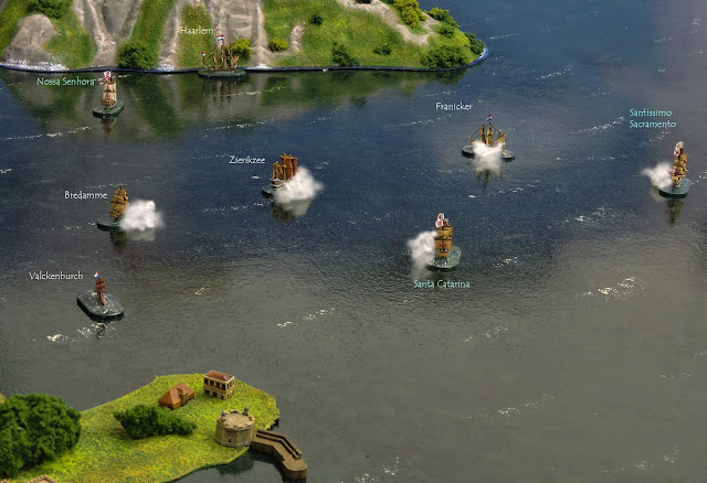 No sooner had der Veere disentangled his ship from the collision than she found herself exchanging gunfire with the enemy flagship. The Portuguese gunners showed great skill and the opening broadside from Santissimo Sacramento completely dismasted Haarlem which had sustained considerable damage in the accidental collision but a few minutes before. This high drama of this opening exchange suggested the action may be short and sharp.