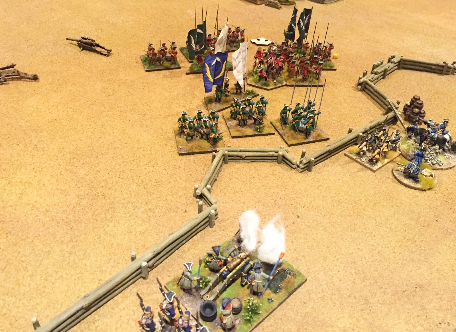 Having used the battering cannon to support my infantry in chasing the garrison out of the village (in fact annihilating them) the attack I was teeing up on the main Swedish line had to be reformed twice before a final depleted and desperate assault by three battalions almost carried the breastworks before collapsing completely.