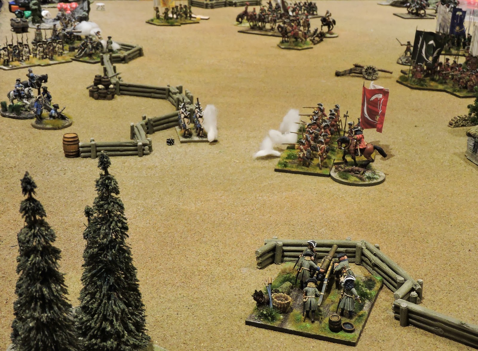 The game unfolded in an intriguing way. The 6 x 4 table meant that the Russian heavy battery was within short range of the BuA right from the start and pounded it mercilessly. I sensed Bob's trepidation of impeding disaster as the guns minced the garrison for the first three turns... how wrong those gut instincts can be!