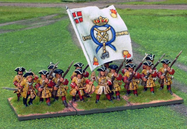 The Garden til Fods (Foot Guards) was a two battalion regiment dressed in a distinctive straw-yellow coat with dark red facings. It is often portrayed as wearing bright yellow with scarlet facings but this is inaccurate if for no other reason than the lack of dye availability to fix those colours.