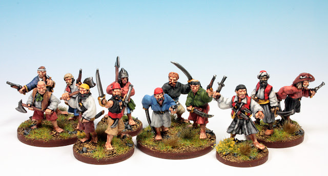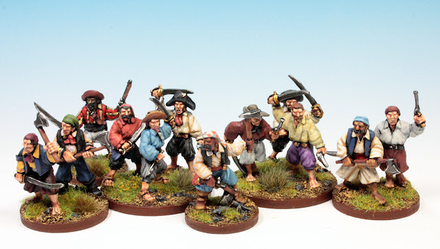 These models can be used as privateers and general ship crew for every nation in the West Indies throughout the 17th and 18th centuries. There will be a few anachronisms of dress across this broad range - tricorns in 1635 and ECW era trousers in 1750 - but the general appearance will serve, at least for me.Right away, I knew I wanted to be able to use the collection for Donnybrook and Beneath the Lily Banners - The War of Three Kings and that meant finding a basing method that would work for either game. One option would be sabot bases, to group six singly mounted bases, but I've never likes the look of those. My foot dragoons for BLB have been simply left as skirmishers and I crowd them together to represent a standard formation.
