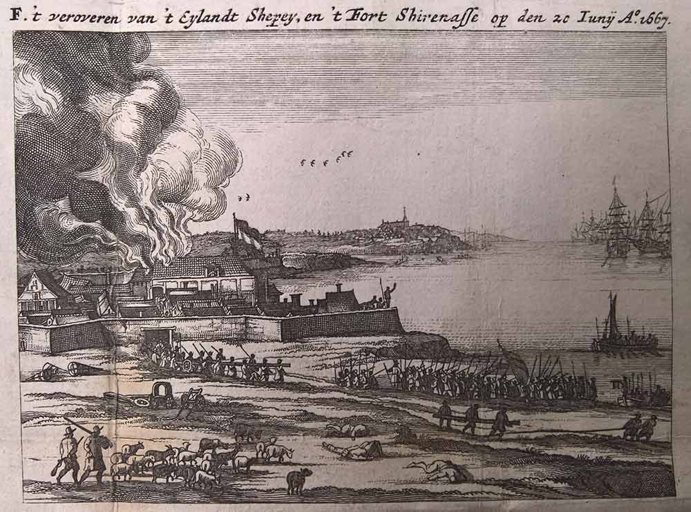 Contemporary Dutch print of the attack on the Fort. Isle of Grain in the distance. It has clearly already been taken. |