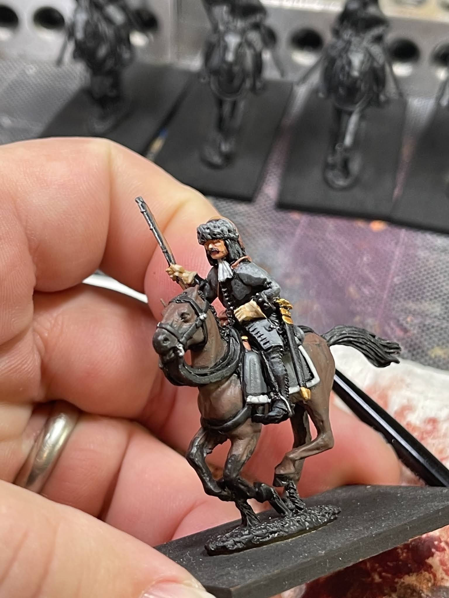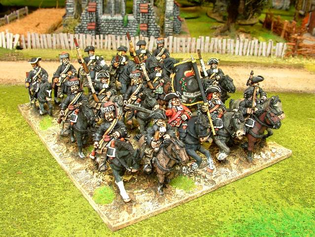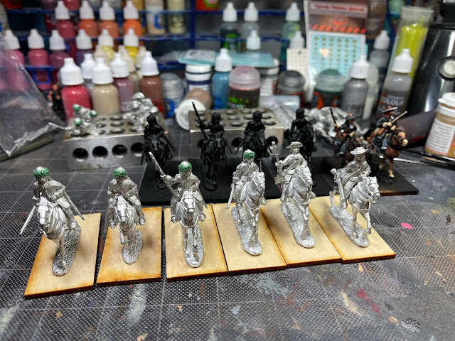 I've used the "regular" Warfare Miniatures horses rather than the ones that come with the dragoon castings. My initial units of dragoons were assembled before we had the ponies. I didn't want my elite troopers looking into the navels of their counterparts on the other side! Here's a few WiP, ready for action!