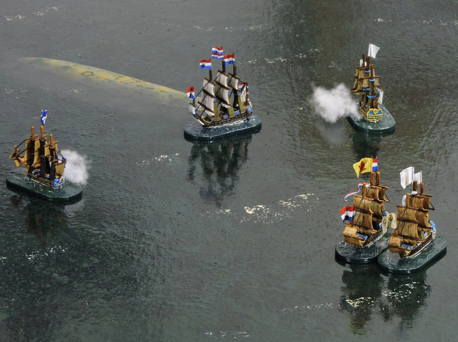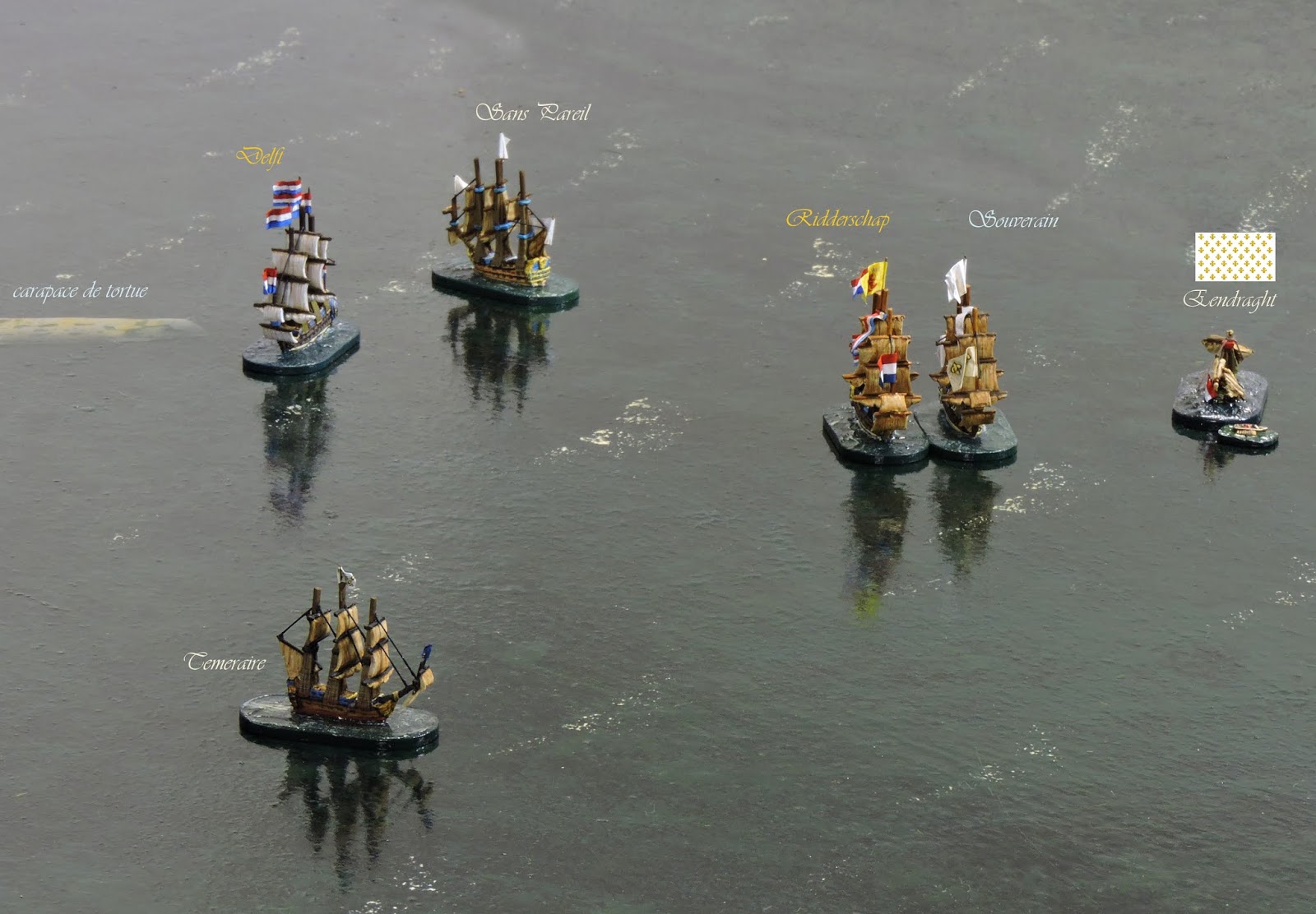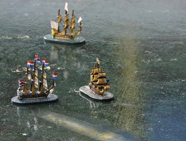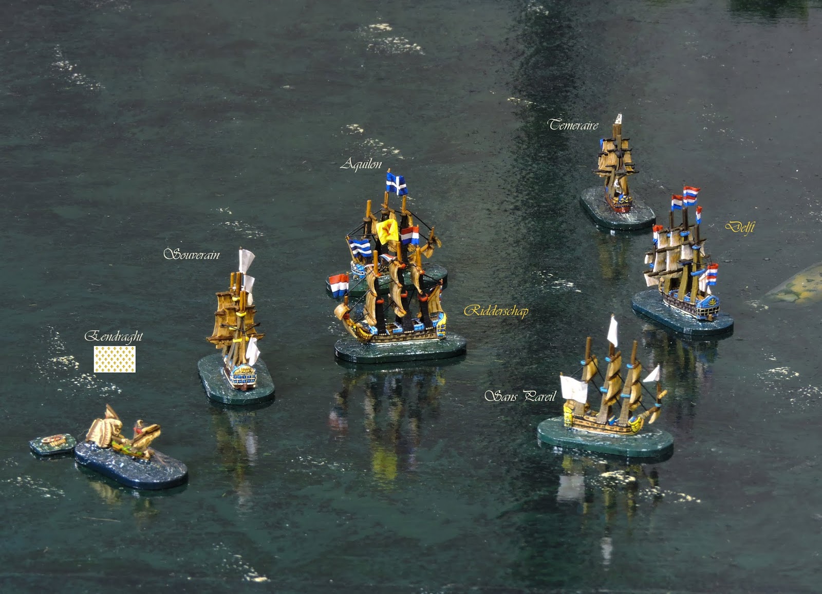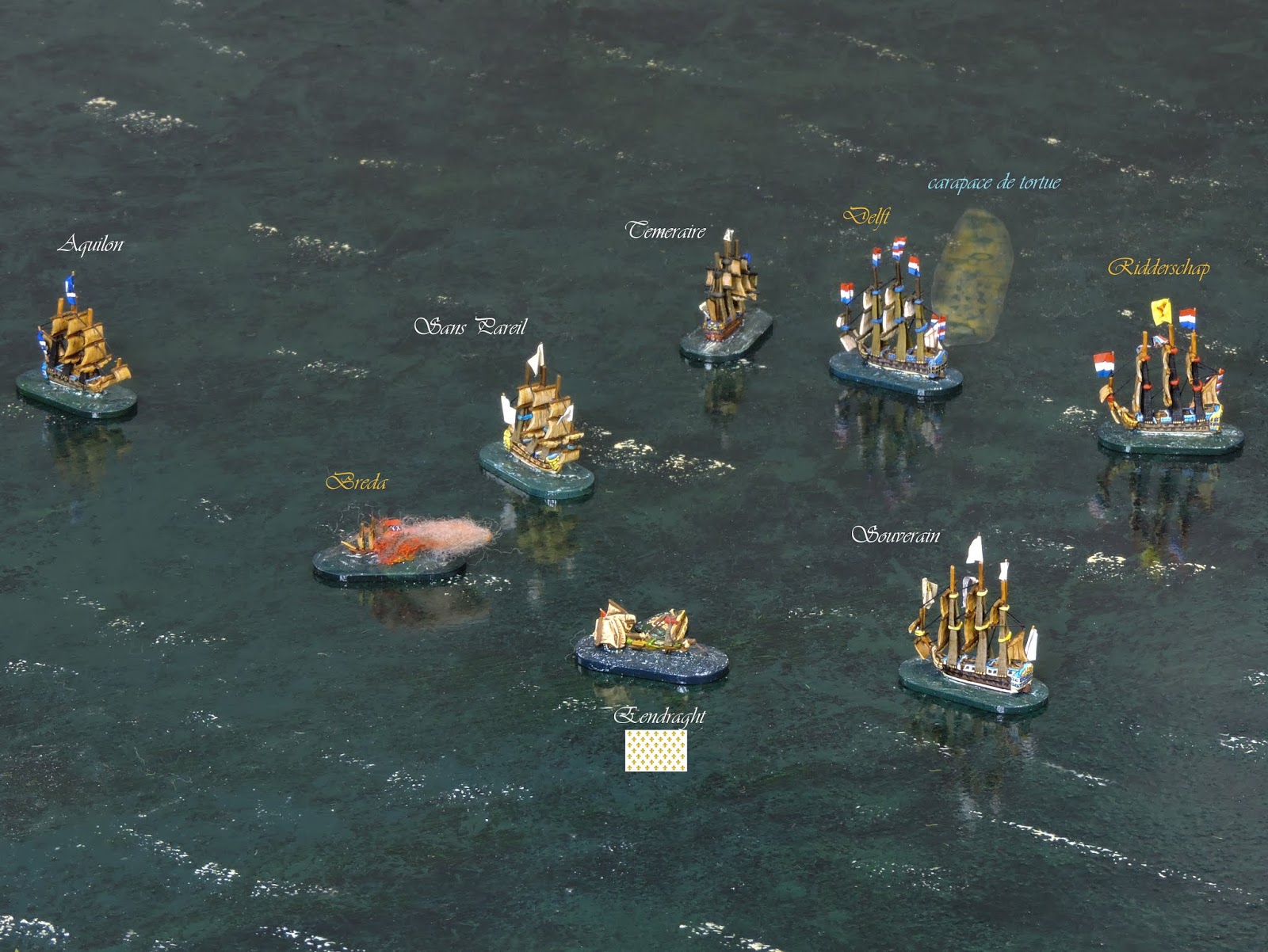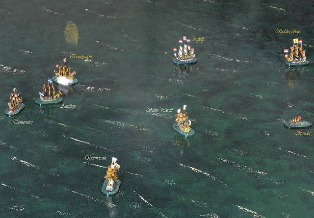 Under Captain van Nes, she opened the account on Turn 4 by scoring hits on Aquilon but, the advanced position soon brought Eendraght within range of other enemy ships.