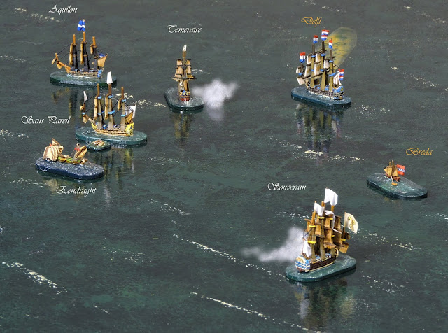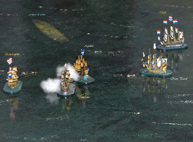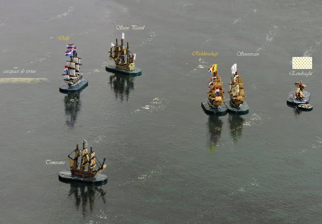 Sailing almost directly into the wind, the larger French ships made slow progress whilst the Aquilon and Téméraire moved more nimbly in an effort to cross the bows of the lead Dutch ship Eendraght, 66 guns.