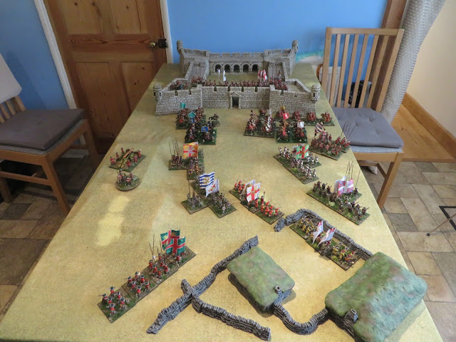 The terrain cloth is from Cigar Box and the cottages and walls are Adrian's Walls.