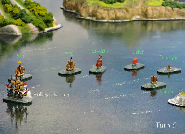 The wind was set from a direction which had both Chinese squadrons close-hauling from turn 1. The Dutch ship had a d3 throw to see how many turns it took to ready for sea from its position at the quayside. The score was 1 and so, Hollandsche Tuin activated on turn 2. The permanent initiative +1 went to Hēisè yănjīng.