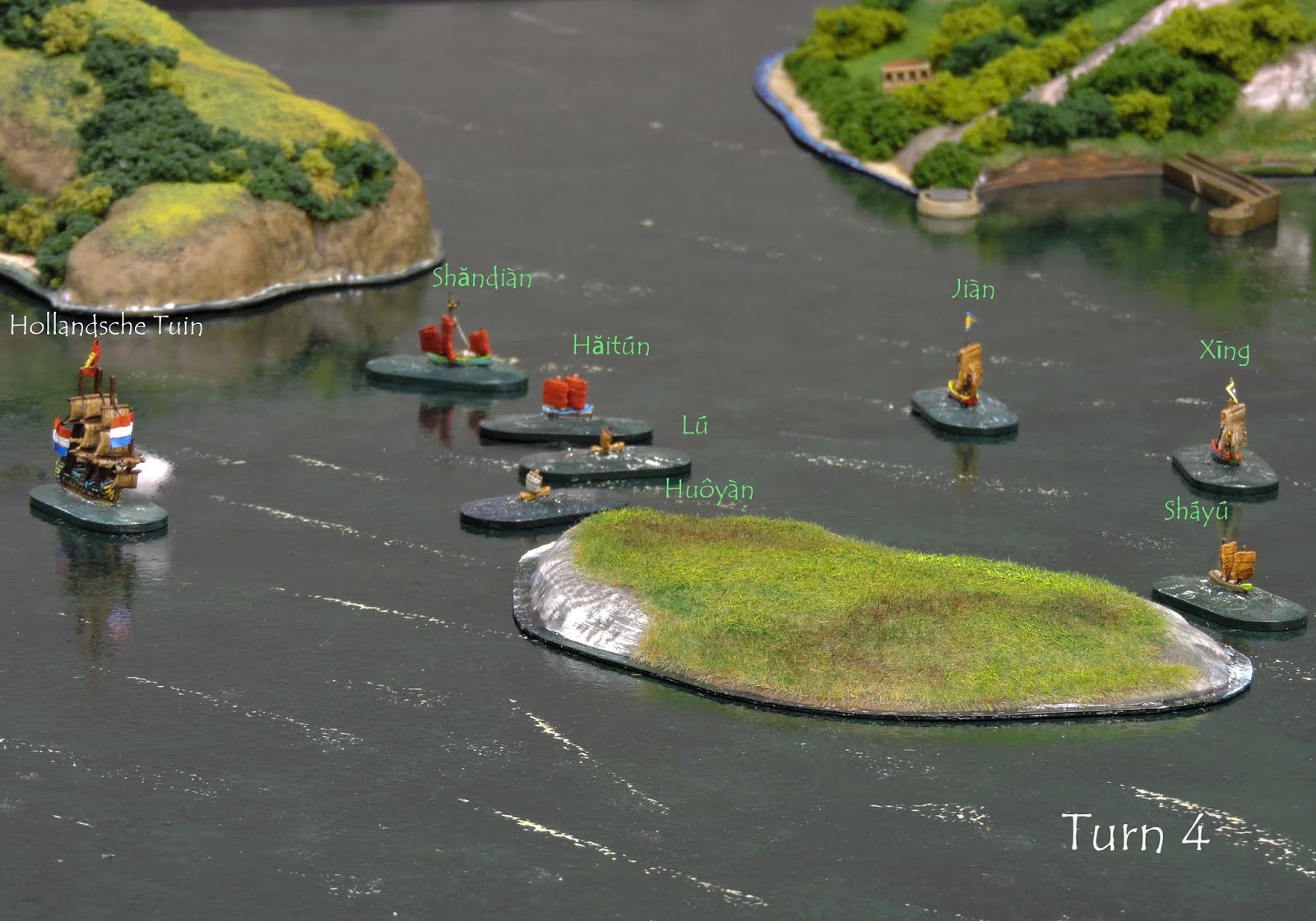 Going was slow for the Chinese because of the wind and by the time they reached the area of the station, the Dutchman was already at sea and sailing amongst them. The action opened on turn 3 with Rijsbergen landing shot upon Hăitún. The light guns reloaded quickly and on turn 4 the VOC ship landed a catastrophic hit on the little fire junk Lú totally dismasting her. She drifted with the wind for the rest of the battle occasionally obscuring fire arcs as she moved slowly through the water.