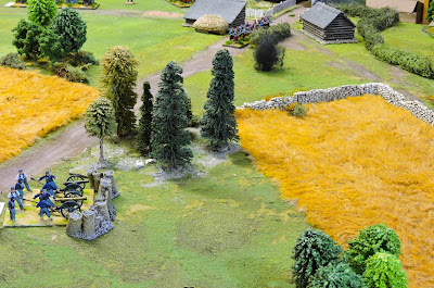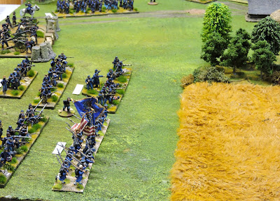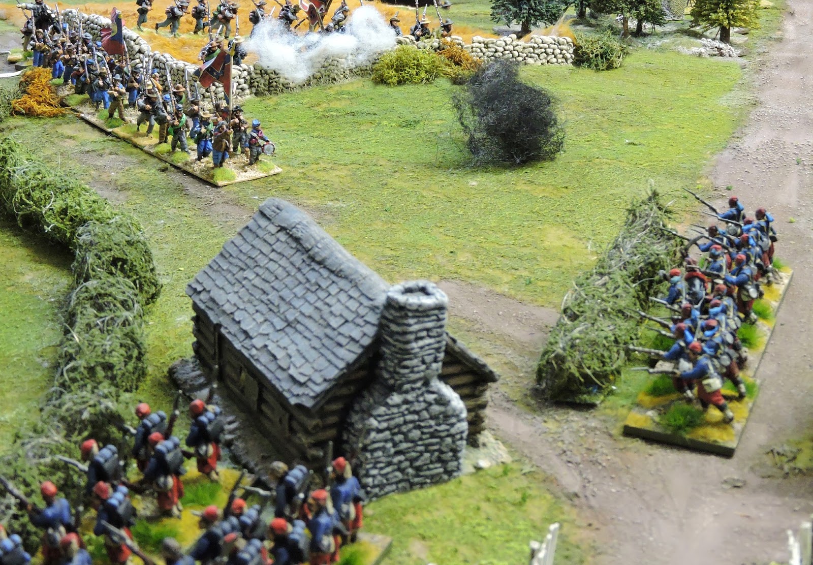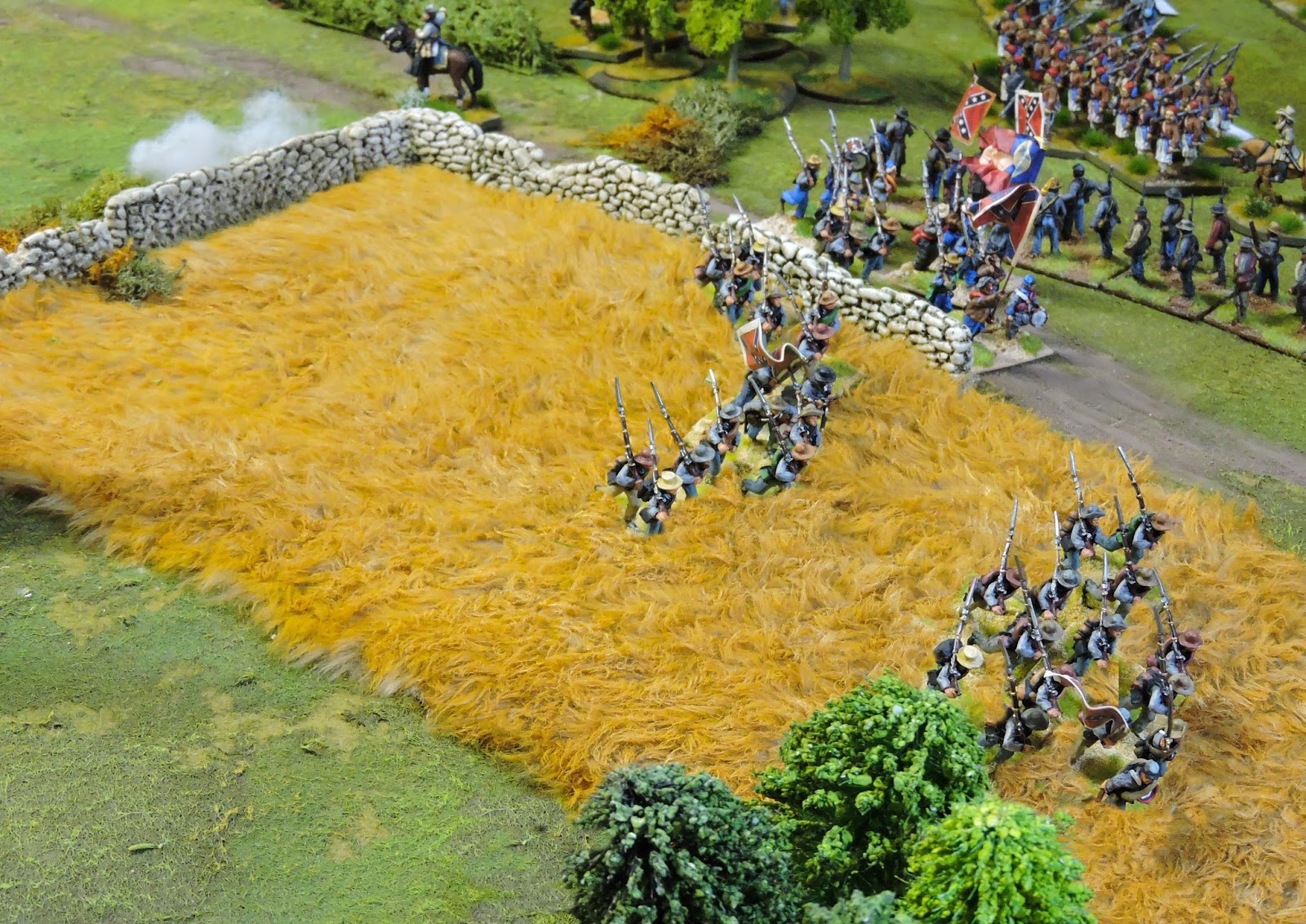 As the former ran through a wheat field they caught enfilade fire from the entrenched E Company battery concealed to the north. Only the intervention of Beauregard and Longstreet prevented total ruination of the brigade which took some time to reassemble at the foot of the hill.