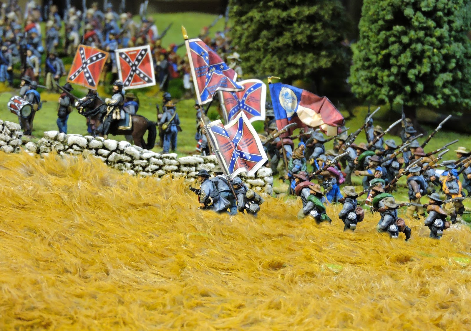 Determined to salvage Southern pride Barry Beauregard soldiered on. Toggy Tyler sat snuggly in position and polished his d6! The Confederate cavalry avoided the chaos of 2,500 routing volunteers and traversed the slope inside the wheat field taking position behind the same stone wall abandoned by the 13th VA about two hours previously.