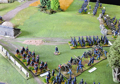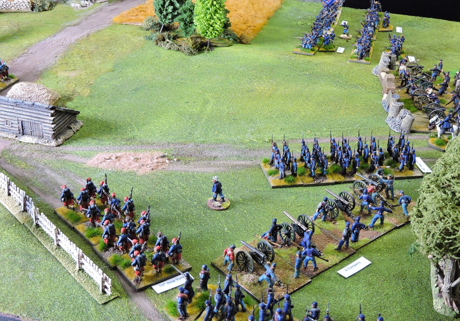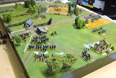 All Federal units were insitu to defend with the exception of the cavalry (arriving when 35 had been achieved by dealing a playing card per turn). The Confederates began with Ewell's Brigade of five green regiments approaching from the south west and Longstreet's Brigade of four green regiments moving from the north west. Using the playing card system a battery of guns would arrive on 21, a cavalry regiment on 35 and Bonham's Brigade of four regiments on 40.