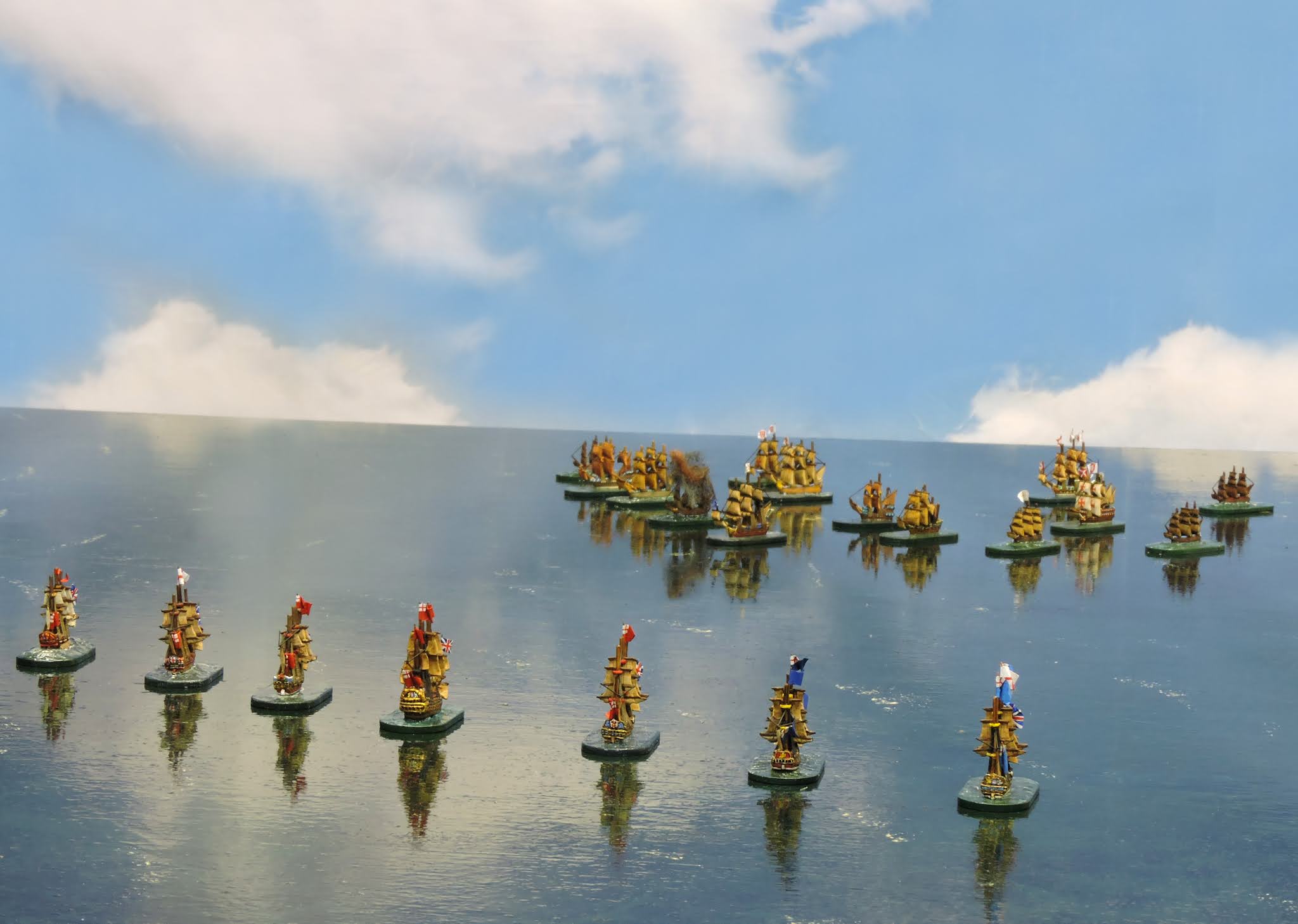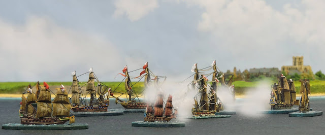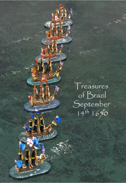 The second scenario zooms forward to the Parliamentarian blockade of Lisboa two years later. Robert Blake's squadron,enraged by the uncooperative Portuguese takes its frustration out on the inbound Brazil Fleet and attempts to capture treasures from South America. Alas, our refight was far from the historical result!