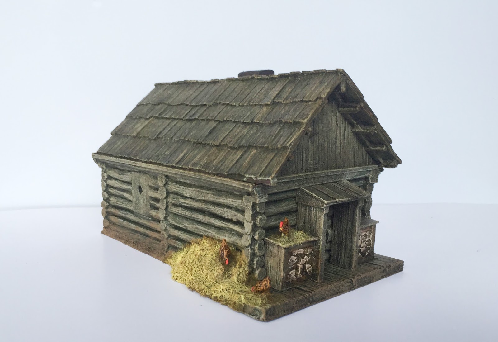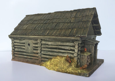 | Log cabin with added straw and chickens! I enjoyed painting the poultry! |