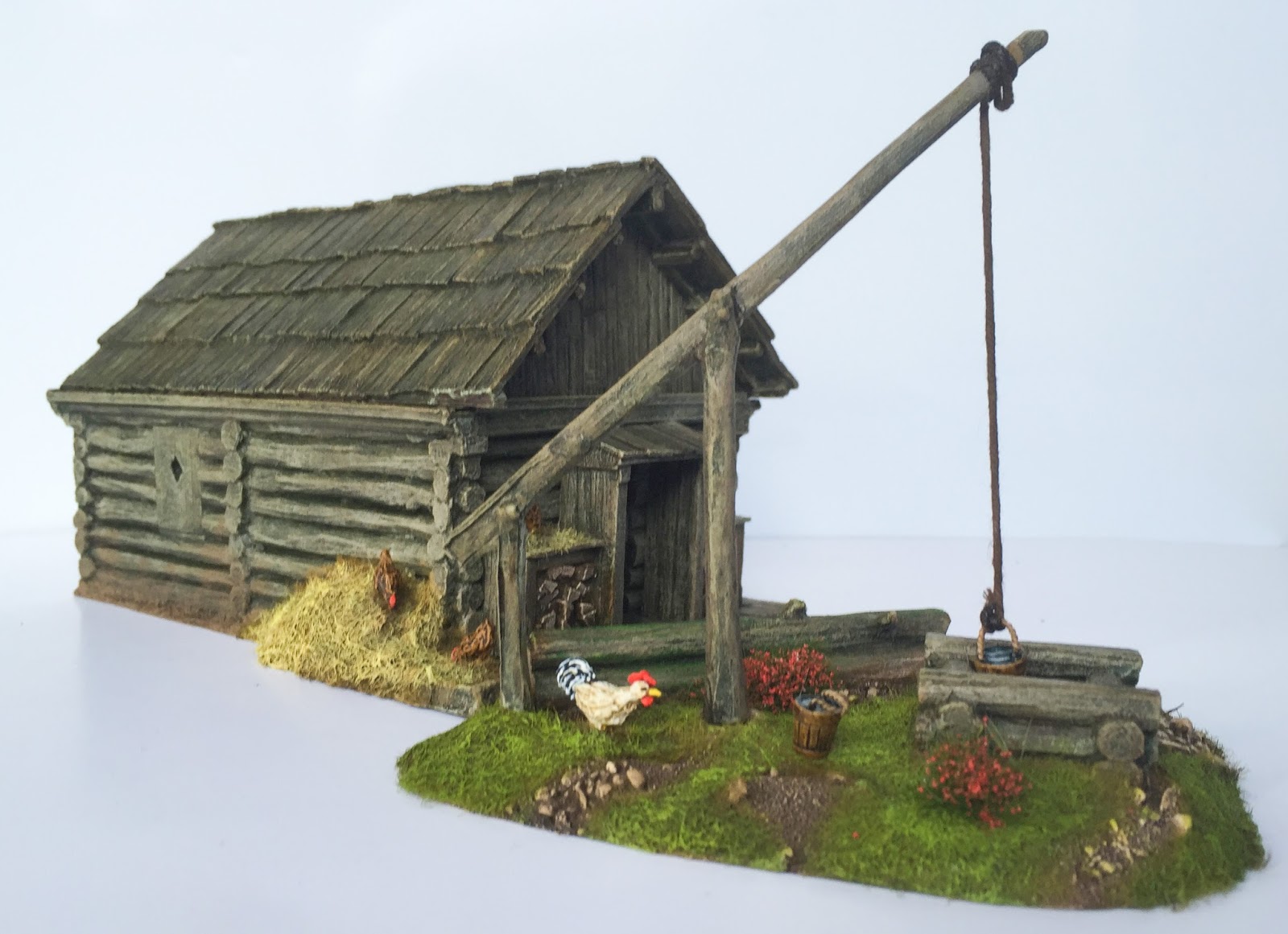 Additional details such as static grass, poultry, ropes for the well, green moss on the cut wood, yacht varnish in the well water, straw added afterwards.