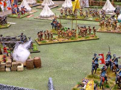 This check was done per regiment per turn. An assembled regiment took a full turn to form up beside its camp and facing in any direction. The camp for each unit was marked by placing tents at various points on the Williamite table side.