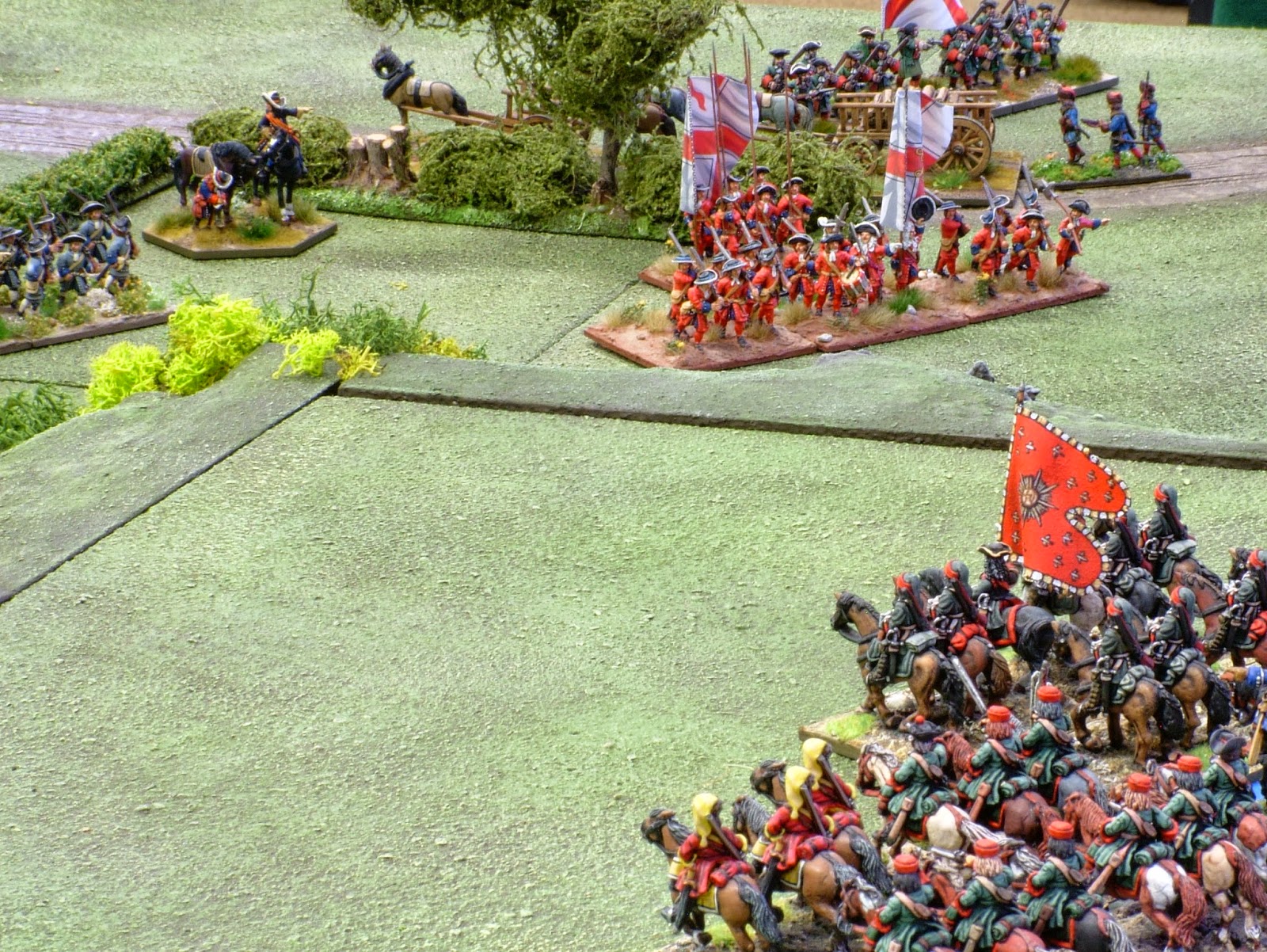 Two Allied brigades (one of three and the other of four battalions) deployed in positions nearest the pursuit secretly made two die throws each before the game started. The first was 2 x DAv. The resultant score was the number of battle casualties sustained earlier in the day during the main battle. The second was an odds/evens call. This determined whether the battalion gained the precious 'First Volley' bonus or whether their weapons were already dirty from action. The reinforcing brigades comprised 3 battalions of Foot (1 x Elite, 2 x Drilled), 4 squadrons of Horse (2 x Guard and 2 x Cuirassier) and 6 squadrons of Dragoons (3 x Guard, 3 x Drilled). Two field guns were in position near the Geete.
