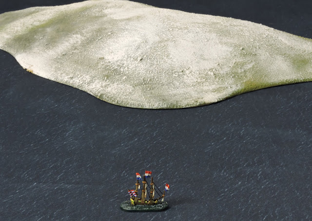 The convoy must past through the dangerous channel between Eilean Dub Mor and the smaller island. The ships must exit on the far table edge and make their way to Dundalk. On board three are general cargo. The fourth has the pay chest for the entire army for the past sixth months. The ship with the money is unknown and is only revealed at the end of the scenario by being drawn from four folded pieces of paper.