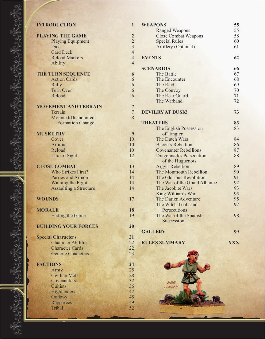 Donnybrook is a fast paced skirmish game designed to cover conflicts across the globe from 1660 to 1760. The basic game of requires a force of 12-48 models, depending on their quality, and one character who represents the player on the table top. Games are played on a 4x4' table. You can add additional units and additional characters as you like, as long as both sides use the same conventions, though you'll need a larger table as you increase the numbers! Donnybrook uses a card driven turn system that creates exciting, unpredictable play. Besides leading government troops into battle, you can choose mobs of armed peasants, murderous brigands, religious fanatics, sinister cultists, ferocious highlanders, or tribal natives. The book includes the rules, faction lists, weapons primer, random events, seven scenarios, a thrilling battle report, a period and theater guide, and a double sided playsheet. The finished book is 112 pages and contains more than 150 awesome photographs by Mr Hilton!