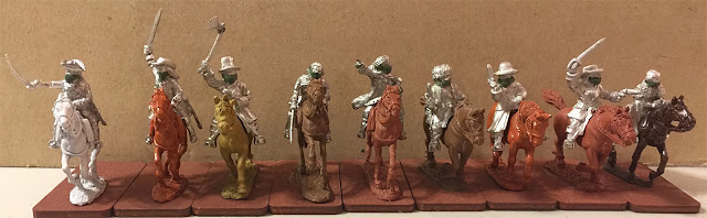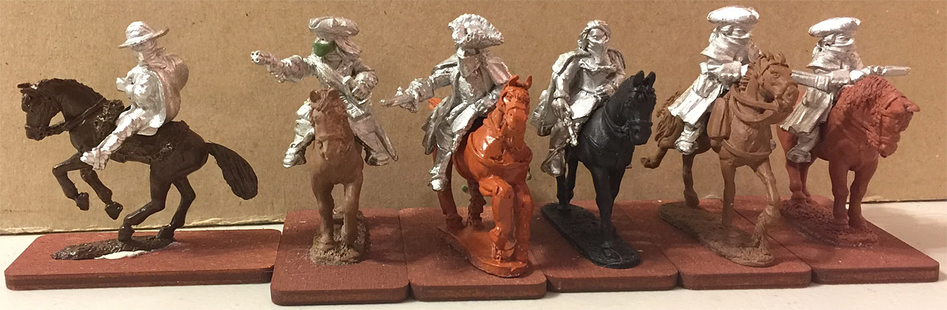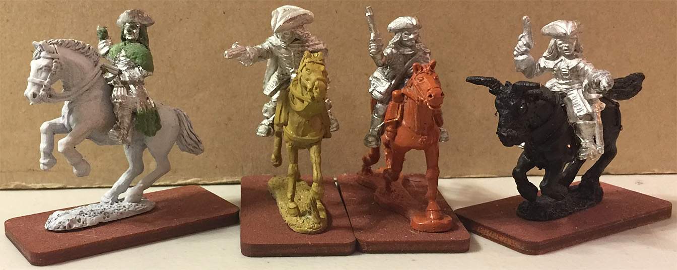 3 Mounted Elite and the Leader, de Zwarte Kapitein. The Black Captain is modelled after a major character in the Dutch TV miniseries, De Legende Van De Bokkerijder. The series is on YouTube. If you like Bokkerijders, watch it! It’s in Dutch with no subtitles; that doesn’t matter. Between the acting and the staging, it is pretty easy to follow most of the plot and enjoy the show. The facemasks for these figures are all in the style of the Kapitein — shaped masks coveing the nose and the upper portion of the face. These were carved in by making a shallow relief line under the cheekbones and will show up in better detail after painting. Bokkenrijder and Bokkerijder are different dialectical spellings.