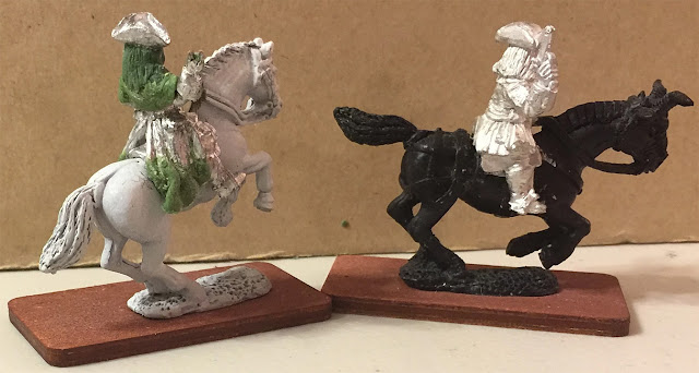 9 Mounted Recruit and 6 Mounted Drilled figures, these received simple kerchief facemasks as needed. The one on the grey horse is the only mounted female figure in a tricorne currently on the market — Bad Squiddo’s Catherine The Great: