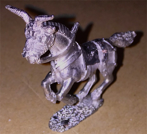 The figure on the black horse was originally planned as the Leader of the faction until I watched the TV series. The mount is a Front Rank Medieval Horse with Head Armour. Then I took an old D&D Chimera figure, sliced the top half of the goat’s head from that (including snout, ears, and horns), and spliced it on top of the horse’s armoured head with a bit of carving and fitting.