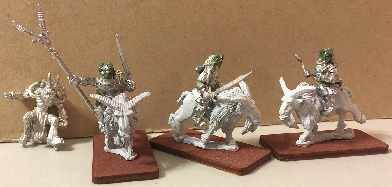 (3) actual Buck-riders, and (1) Abomination for some of the Characters. The mounts, the Standard Bearer,and the Abomination are all by West Wind. With carving and bending, re-positioned the horns of the Abomination; I will treat this character as a Troll or something similar. The rest are a command pack from the Dwarf Wars range. I did some heavy carving on the Standard Bearer to bring his girth down to better match all of the other figures. I spliced the legs of the other buck riders with tops from female Reaper figures to make a Hero with a longsword and a Witch with a hatchet and a bow on her back. Reaper figures are 32mm tall, but splicing the torsos onto seated legs brings them down to 28mm size. These facemasks include goat-horns.