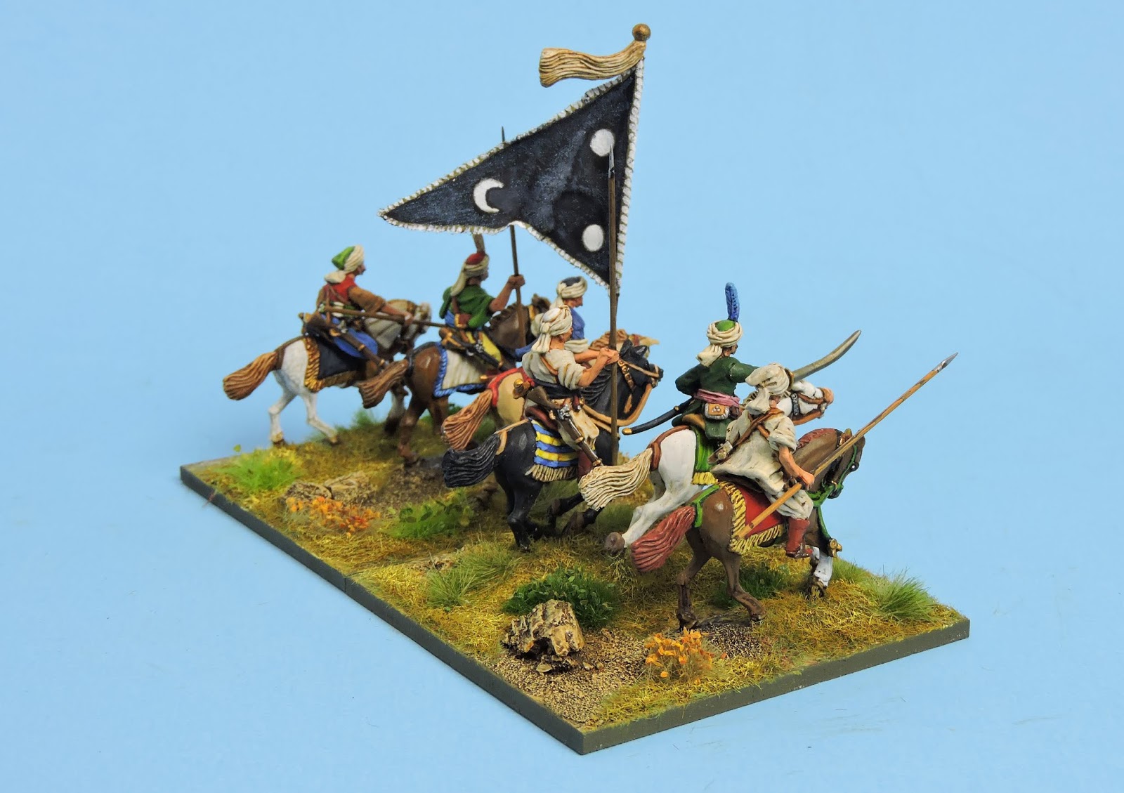 The 75mm wide by 80mm deep bases I use for cavalry allow for the sense of movement to be built into the unit. Two things moved me away from the older style bases I use at the beginning of collecting in this period.