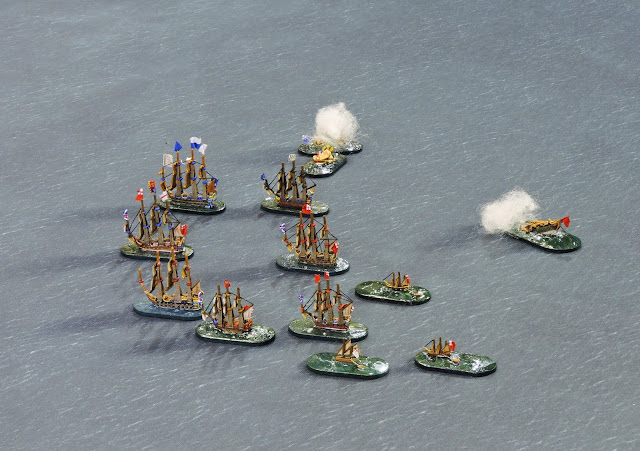 Firstly I learned that I enjoy naval wargaming as much as I did when aged nine. Then gaming involved hand-drawn and coloured plan views of Napoleonic men o'war which sailed round my blue bedroom carpet using a rule set borrowed from the public library. I have such fond memories of those games which I think involved estimating the distance to target in inches and then writing your shots down on a sheet of paper. Does anyone remember those rules? I am talking around 1969-1972.