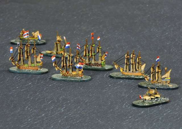Although both fleets were of equal points I thought the Dutch would win because of the larger number of Veteran crews but, naval gaming is not as predictable as land wargaming. Once the shooting begins it is very hard to keep a formation together and turning a ship into the wind is prone to failure and delays.