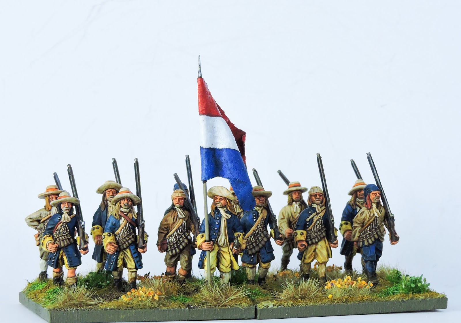 A shot of the first unit of Dutch Marines which I have chosen to paint in blue coats with yellow. More on that later. These are Warfare's V0 series which features 30 different poses with coats, waistcoats and shirts. Musketeers have five arm variants and the 15 open handed codes can take any polearm.