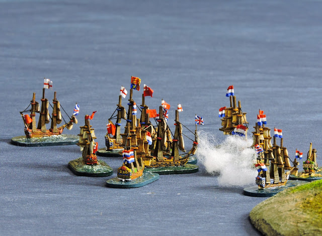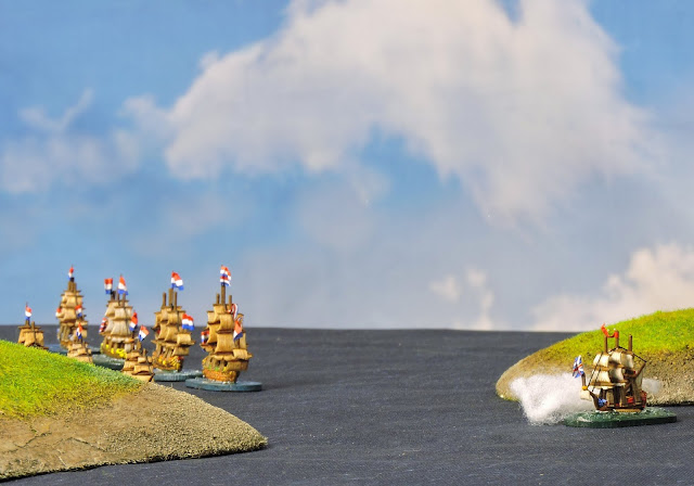 As the Dutch were sailing towards the coast from a north easterly direction they had to steer a course between two islands to gain the open coastal waters beyond. Both sides used strategic movement in T1 but the independent English 5th rates made great speed and so the remarkable battle fired up from the outset.
