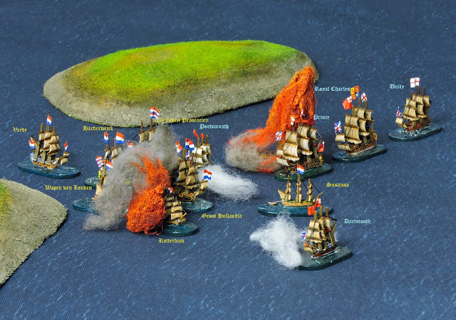 The Dutch Battle Division left the flagship to disentangle itself from the now sinking HMS Portsmouth and tried to cut the enemy line in front of HMS Royal Charles.The fireship Susanna attempted to attack the English flagship but was easily fought off. The English crew in turn grappled the smaller ship, boarded and captured her. Susanna had already been abandoned by her crew. Every Dutch ship passing the stricken HMS Prince shot into her forcing the giant to strike her colours having been reduced to a wreck.