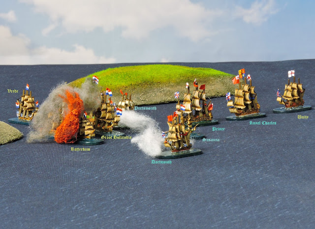 It was a bloody battle, over quickly and containing several notable incidents. I declared it a Dutch victory. The Dutch lost one vessel sunk, two captured with damage to three more including the Vrede being partially de-masted however, their flagship was intact and two well armed ships remained operational. The English lost their two largest vessels one destroyed and the flagship captured. A frigate was destroyed and remained barely afloat whilst both HMS Unity and HMS Dartmouth were damaged to an extent.