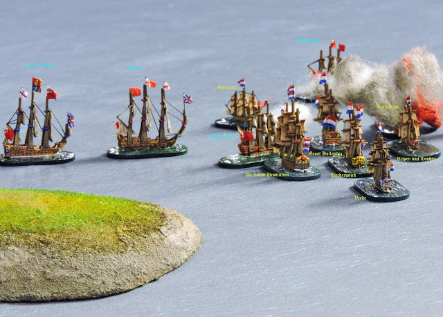 The Groot Hollandia came alongside HMS Royal Charles, both intending to board each other but the Dutch 3rd rate had the initiative and attacked the English flagship. In a fierce back and forth combat the English marines prevailed and the Groot Hollandia was taken and quickly cut adrift with a small prize crew aboard because De Zeven Provincien was looming through the smoke astern of the English ship and on course to smash into her on account of having no control of her steering.