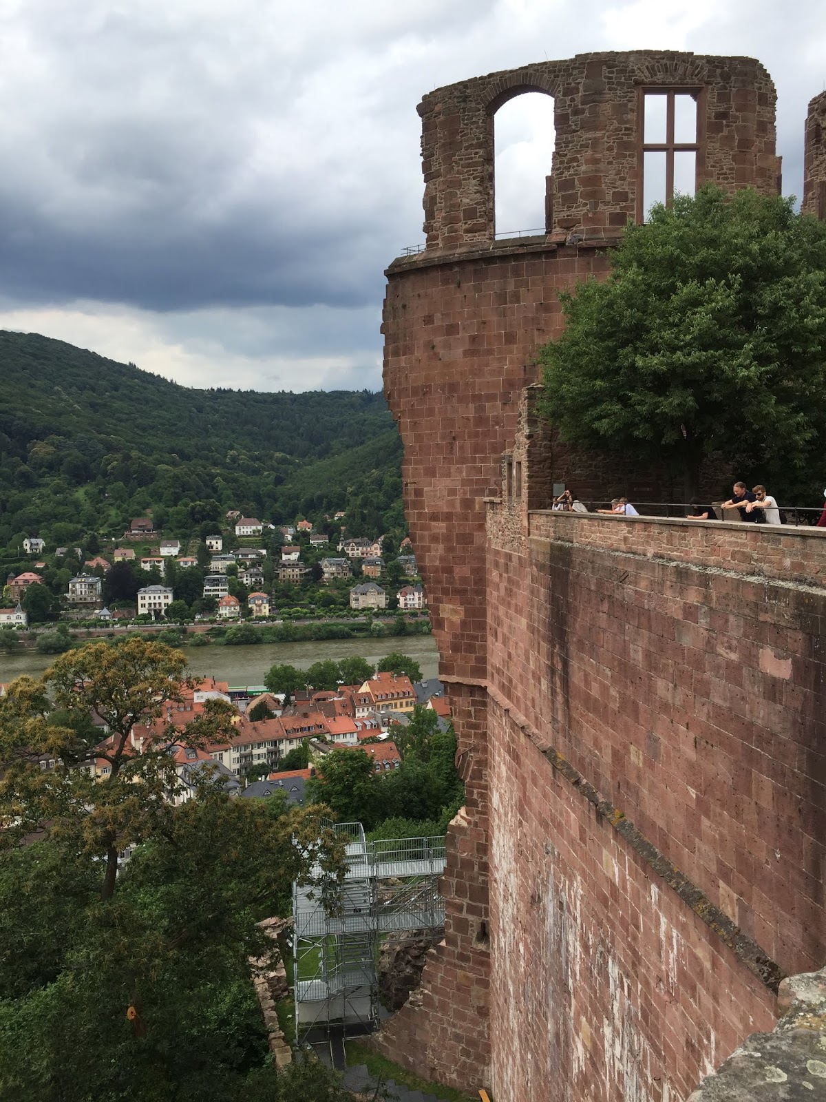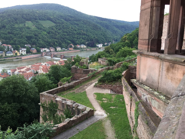 | The view from the castle down into the town and the Alte Bruecke over the River Neckar which is a Rhine tributary. |