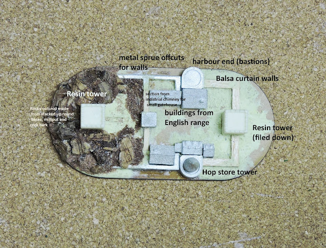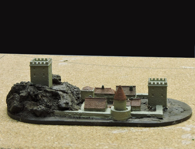 Of course there are purchased components here - the towers, the houses, the bastions. The curtain walls, the heights, the small gatehouse are all scrap pieces, sprues and balsa.