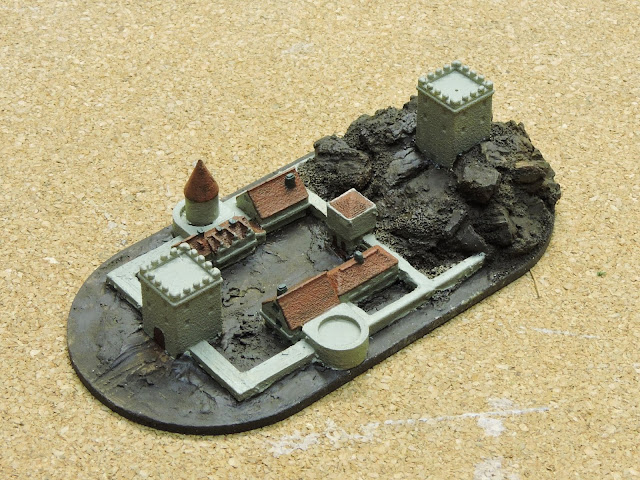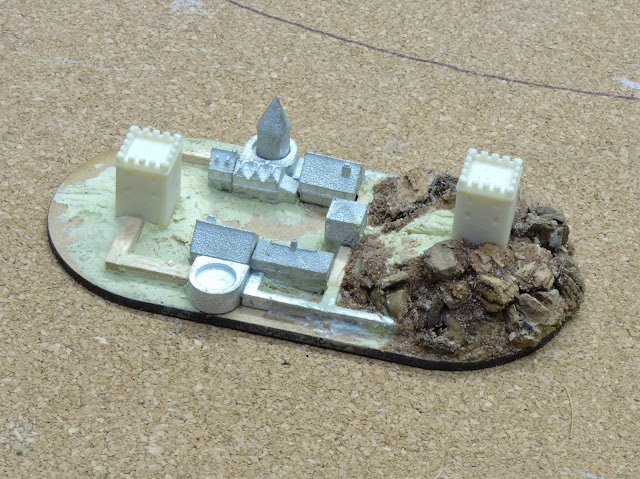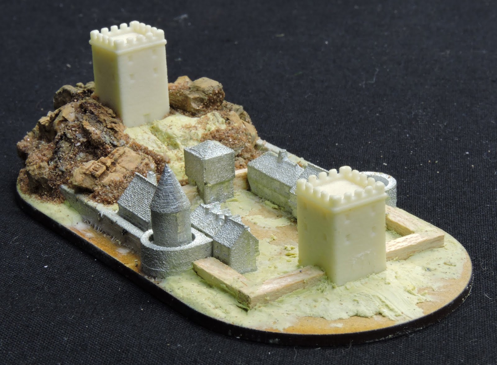 To give the main tower extra height I put it on high ground build of milliput covering three stacked round bases. I also filed an identical tower down by about 5mm and based it lower down, scratching inner and outer gates into the resin with a scalpel.