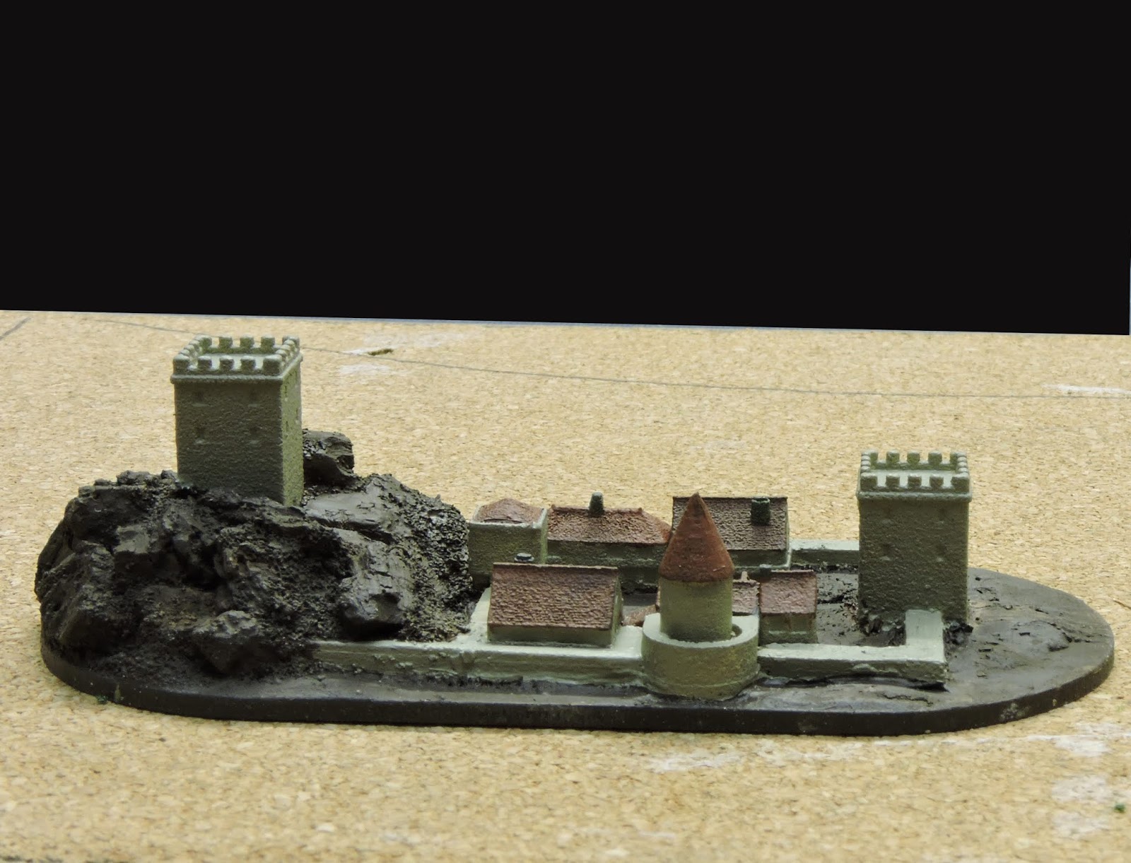 The large square towers are from the castle set selection and are resin. The houses come from the English town buildings and the Kentish industrial set. The base is a 2mm thick MDF piece from Warbases.